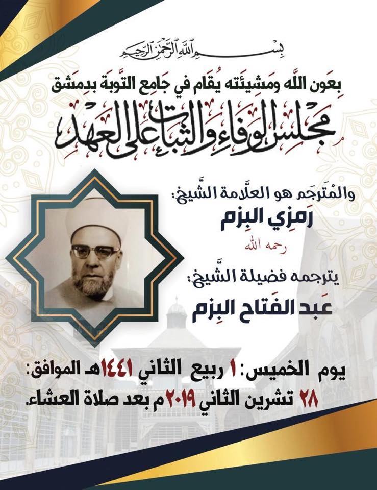 دعوة لحضور ترجمة فضيلة العلامة الشيخ رمزي البزم - رحمه الله تعالى- في جامع التوبة.